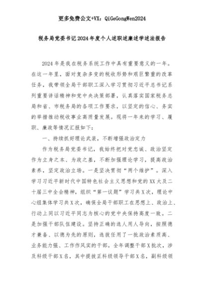 【七哥公文】2025年:税务局党委书记2024年度个人述职述廉述学述法报告+更多免费公文+VX:QiGeGongWen2024+更多免费公文+VX:QiGeGongWen2024