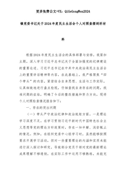 【七哥公文】2025年:镇党委书记关于2024年度民主生活会个人对照查摆剖析材料+更多免费公文+VX:QiGeGongWen2024+更多免费公文+VX:QiGeGongWen2024