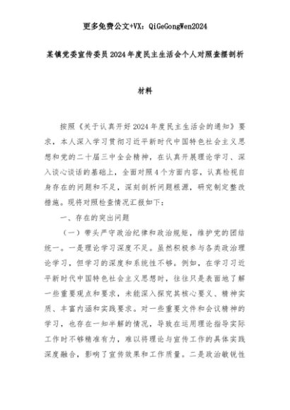 【七哥公文】2025年:某镇党委宣传委员2024年度民主生活会个人对照查摆剖析材料+更多免费公文+VX:QiGeGongWen2024+更多免费公文+VX:QiGeGongWen2024