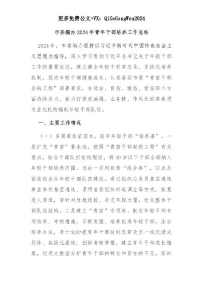 【七哥公文】2025年:市委编办2024年青年干部培养工作总结+更多免费公文+VX:QiGeGongWen2024+更多免费公文+VX:QiGeGongWen2024