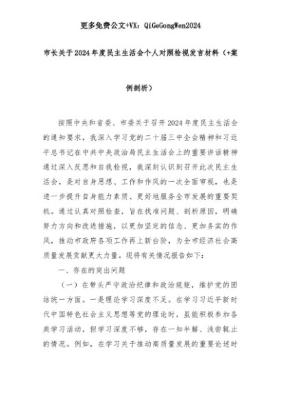 【七哥公文】2025年:市长关于2024年度民主生活会个人对照检视发言材料(+案例剖析)+更多免费公文+VX:QiGeGongWen2024+更多免费公文+VX:QiGeGongWen2024