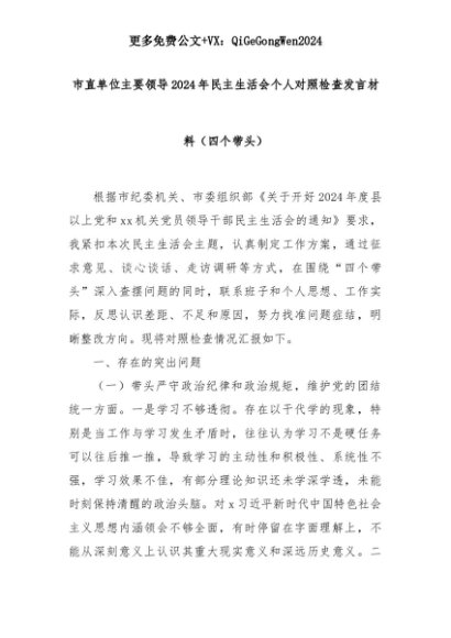 【七哥公文】2025年:市直单位主要领导2024年民主生活会个人对照检查发言材料(四个带头)+更多免费公文+VX:QiGeGongWen2024+更多免费公文+VX:QiGeGongWen2024