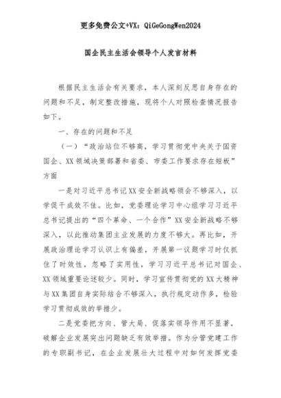 【七哥公文】2025年:国企民主生活会领导个人发言材料+更多免费公文+VX:QiGeGongWen2024+更多免费公文+VX:QiGeGongWen2024