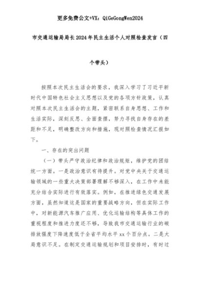 【七哥公文】2025年:市交通运输局局长2024年民主生活个人对照检查发言(四个带头)+更多免费公文+VX:QiGeGongWen2024+更多免费公文+VX:QiGeGongWen2024