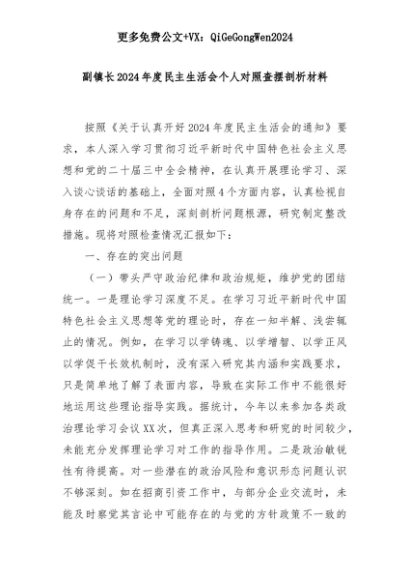 【七哥公文】2025年:副镇长2024年度民主生活会个人对照查摆剖析材料+更多免费公文+VX:QiGeGongWen2024+更多免费公文+VX:QiGeGongWen2024
