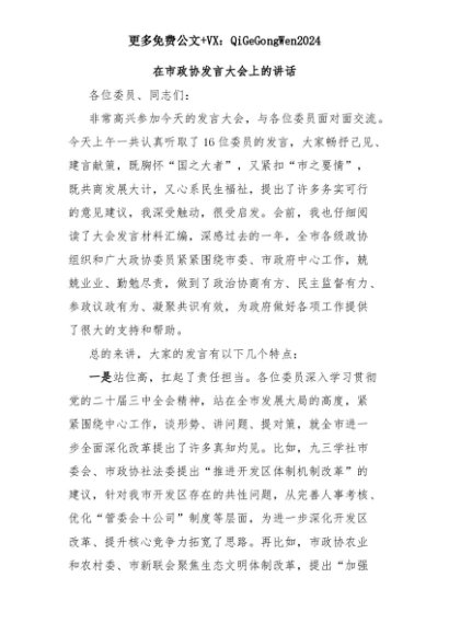 【七哥公文】2025年:在市政协发言大会上的讲话+更多免费公文+VX:QiGeGongWen2024+更多免费公文+VX:QiGeGongWen2024