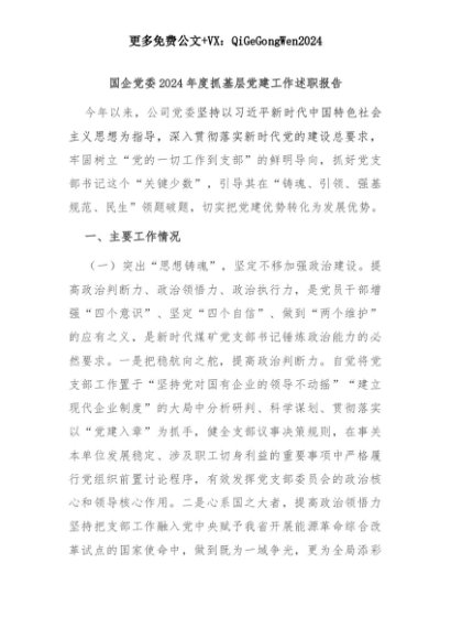 【七哥公文】2025年:国企党委2024年度抓基层党建工作述职报告+更多免费公文+VX:QiGeGongWen2024+更多免费公文+VX:QiGeGongWen2024