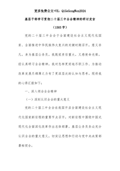 【七哥公文】2025年:基层干部学习贯彻二十届三中全会精神的研讨发言(1565字)+更多免费公文+VX:QiGeGongWen2024+更多免费公文+VX:QiGeGongWen2024