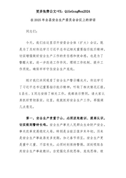 【七哥公文】2025年:在2025年全县安全生产委员会会议上的讲话+更多免费公文+VX:QiGeGongWen2024+更多免费公文+VX:QiGeGongWen2024