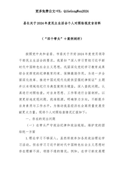 【七哥公文】2025年:县长关于2024年度民主生活会个人对照检视发言材料(“四个带头”+案例剖析)+更多免费公文+VX:QiGeGongWen2024+更多免费公文+VX:QiGeGongWen2024