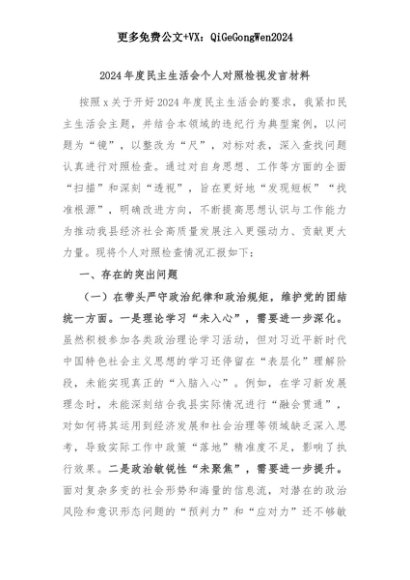 【七哥公文】2025年:2024年度民主生活会个人对照检视发言材料+更多免费公文+VX:QiGeGongWen2024+更多免费公文+VX:QiGeGongWen2024