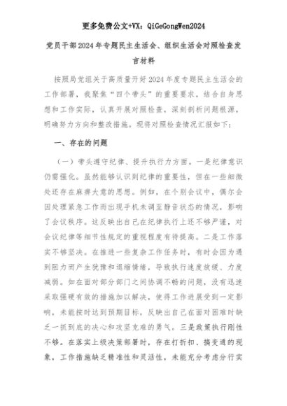 【七哥公文】2025年:党员干部2024年专题民主生活会、组织生活会对照检查发言材料+更多免费公文+VX:QiGeGongWen2024+更多免费公文+VX:QiGeGongWen2024