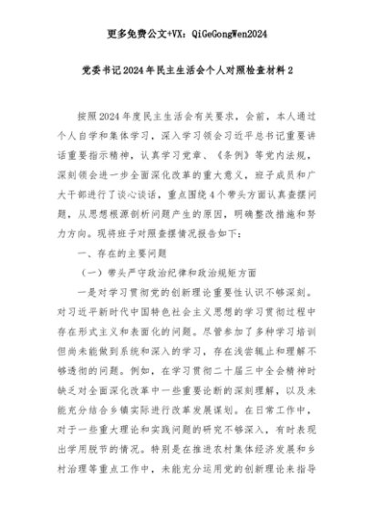【七哥公文】2025年:党委书记2024年民主生活会个人对照检查材料2+更多免费公文+VX:QiGeGongWen2024+更多免费公文+VX:QiGeGongWen2024
