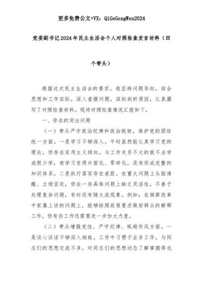 【七哥公文】2025年:党委副书记2024年民主生活会个人对照检查发言材料(四个带头)+更多免费公文+VX:QiGeGongWen2024+更多免费公文+VX:QiGeGongWen2024