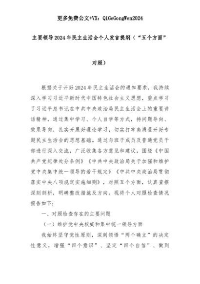 【七哥公文】2025年:主要领导2024年民主生活会个人发言提纲(“五个方面”对照)+更多免费公文+VX:QiGeGongWen2024+更多免费公文+VX:QiGeGongWen2024