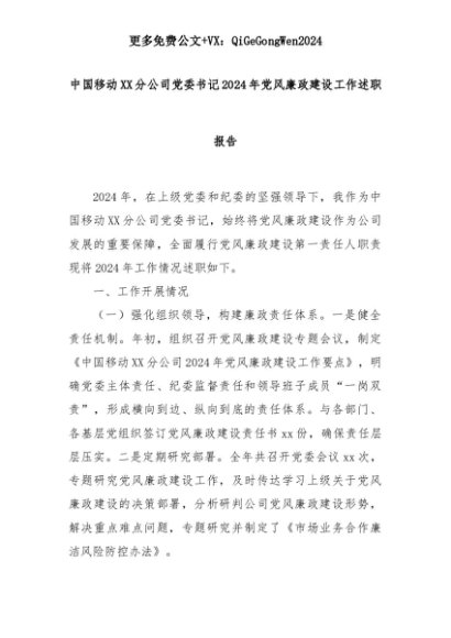 【七哥公文】2025年:中国移动XX分公司党委书记2024年党风廉政建设工作述职报告+更多免费公文+VX:QiGeGongWen2024+更多免费公文+VX:QiGeGongWen2024