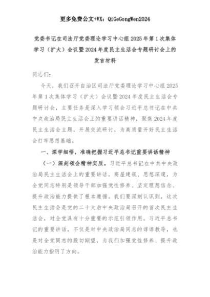 【七哥公文】2025年:党委书记在司法厅党委理论学习中心组2025年第1次集体学习(扩大)会议暨2024年度民主生活会专题研讨会上的发言材料+更多免费公文+VX:QiGeGongWen2024+更多免费公文+VX:QiGeGongWen2024