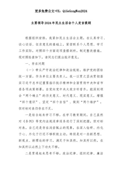 【七哥公文】2025年:主要领导2024年民主生活会个人发言提纲+更多免费公文+VX:QiGeGongWen2024+更多免费公文+VX:QiGeGongWen2024