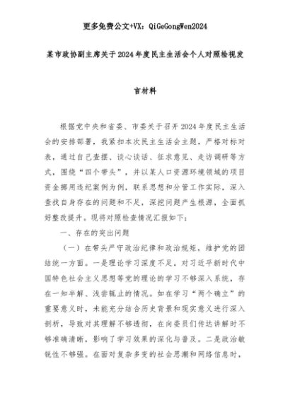 【七哥公文】2025年:某市政协副主席关于2024年度民主生活会个人对照检视发言材料+更多免费公文+VX:QiGeGongWen2024+更多免费公文+VX:QiGeGongWen2024
