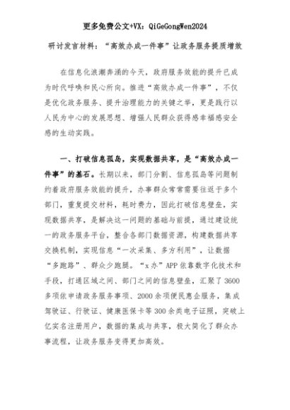 【七哥公文】2025年:研讨发言材料:“高效办成一件事”让政务服务提质增效+更多免费公文+VX:QiGeGongWen2024+更多免费公文+VX:QiGeGongWen2024