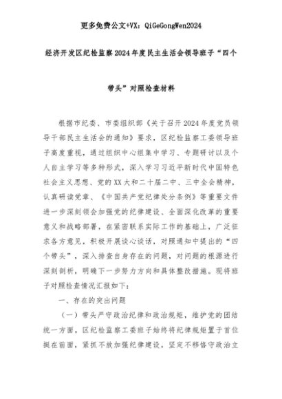 【七哥公文】2025年:经济开发区纪检监察2024年度民主生活会领导班子“四个带头”对照检查材料+更多免费公文+VX:QiGeGongWen2024+更多免费公文+VX:QiGeGongWen2024