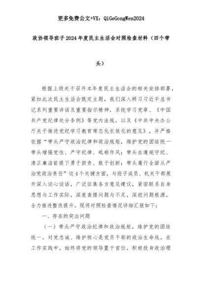 【七哥公文】2025年:政协领导班子2024年度民主生活会对照检查材料(四个带头)+更多免费公文+VX:QiGeGongWen2024+更多免费公文+VX:QiGeGongWen2024