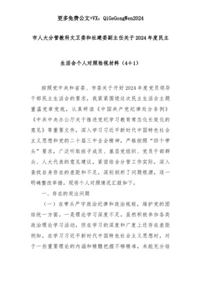 【七哥公文】2025年:市人大分管教科文卫委和社建委副主任关于2024年度民主生活会个人对照检视材料(4+1)+更多免费公文+VX:QiGeGongWen2024+更多免费公文+VX:QiGeGongWen2024