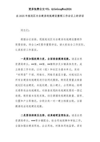 【七哥公文】2025年:在2025年规划区内自建房违规建设整顿工作会议上的讲话+更多免费公文+VX:QiGeGongWen2024+更多免费公文+VX:QiGeGongWen2024
