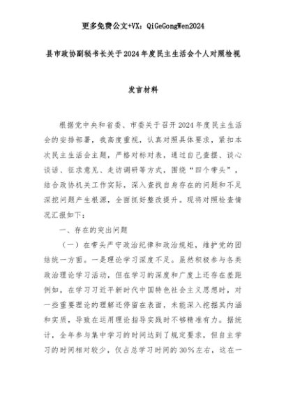 【七哥公文】2025年:县市政协副秘书长关于2024年度民主生活会个人对照检视发言材料+更多免费公文+VX:QiGeGongWen2024+更多免费公文+VX:QiGeGongWen2024