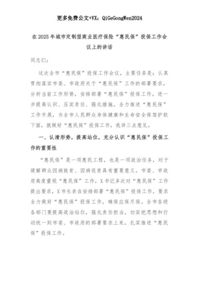 【七哥公文】2025年:在2025年城市定制型商业医疗保险“惠民保”投保工作会议上的讲话+更多免费公文+VX:QiGeGongWen2024+更多免费公文+VX:QiGeGongWen2024