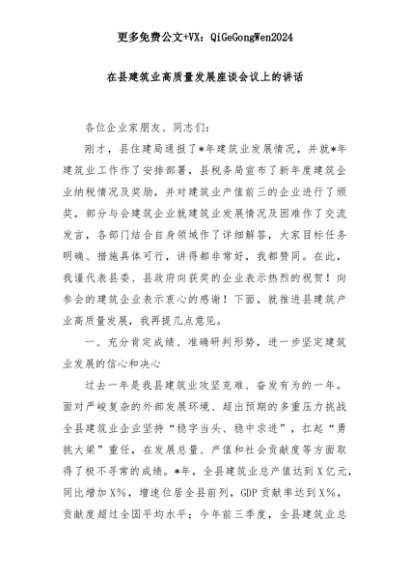 【七哥公文】2025年:在县建筑业高质量发展座谈会议上的讲话+更多免费公文+VX:QiGeGongWen2024+更多免费公文+VX:QiGeGongWen2024