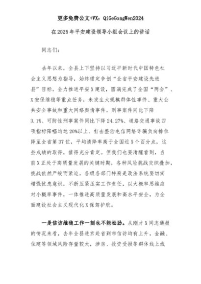 【七哥公文】2025年:在2025年平安建设领导小组会议上的讲话+更多免费公文+VX:QiGeGongWen2024+更多免费公文+VX:QiGeGongWen2024
