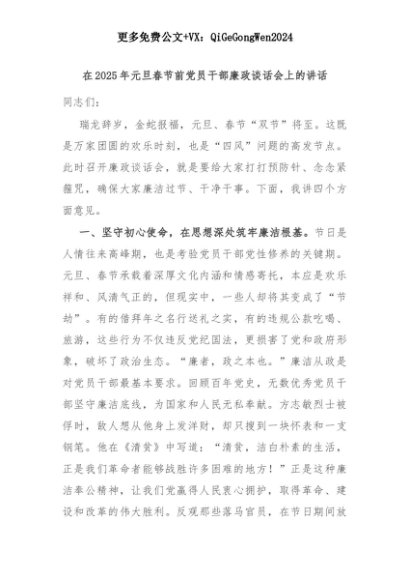 【七哥公文】2025年:在2025年元旦春节前党员干部廉政谈话会上的讲话+更多免费公文+VX:QiGeGongWen2024+更多免费公文+VX:QiGeGongWen2024