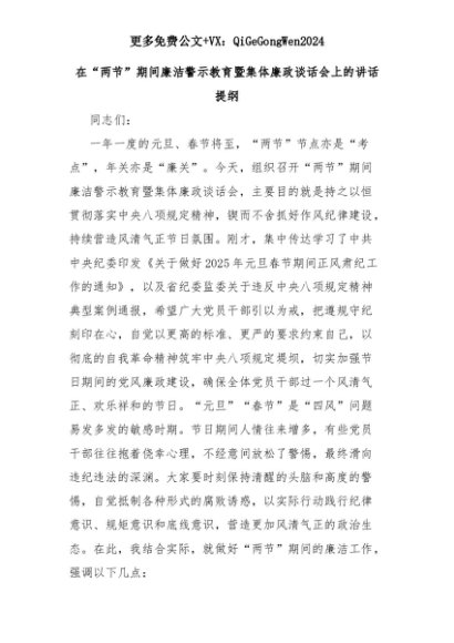 【七哥公文】2025年:在“两节”期间廉洁警示教育暨集体廉政谈话会上的讲话提纲+更多免费公文+VX:QiGeGongWen2024+更多免费公文+VX:QiGeGongWen2024