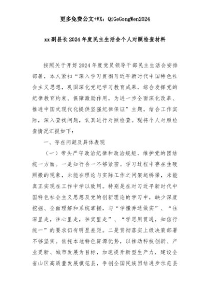 【七哥公文】2025年:xx副县长2024年度民主生活会个人对照检查材料+更多免费公文+VX:QiGeGongWen2024+更多免费公文+VX:QiGeGongWen2024
