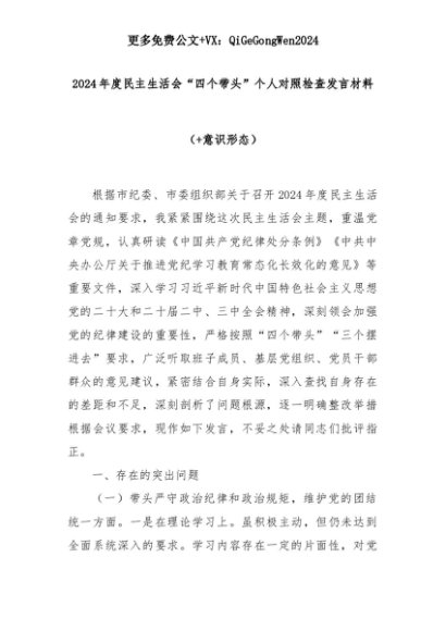 【七哥公文】2025年:2024年度民主生活会“四个带头”个人对照检查发言材料(+意识形态)+更多免费公文+VX:QiGeGongWen2024+更多免费公文+VX:QiGeGongWen2024