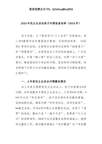 【七哥公文】2025年:2024年民主生活会班子对照检查材料(5634字)+更多免费公文+VX:QiGeGongWen2024+更多免费公文+VX:QiGeGongWen2024