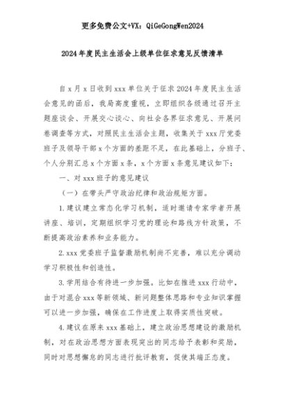 【七哥公文】2025年:2024年度民主生活会上级单位征求意见反馈清单+更多免费公文+VX:QiGeGongWen2024+更多免费公文+VX:QiGeGongWen2024