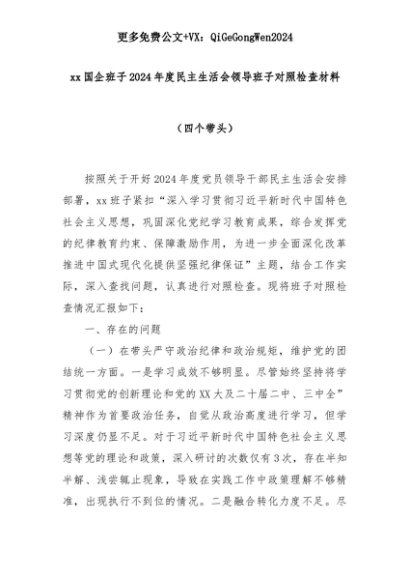 【七哥公文】2025年:xx国企班子2024年度民主生活会领导班子对照检查材料(四个带头)+更多免费公文+VX:QiGeGongWen2024+更多免费公文+VX:QiGeGongWen2024