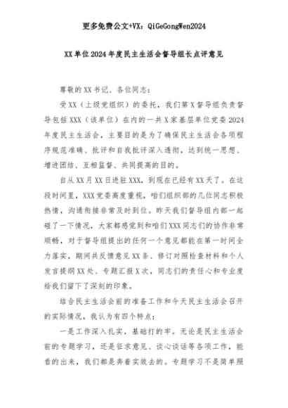 【七哥公文】2025年:XX单位2024年度民主生活会督导组长点评意见+更多免费公文+VX:QiGeGongWen2024+更多免费公文+VX:QiGeGongWen2024