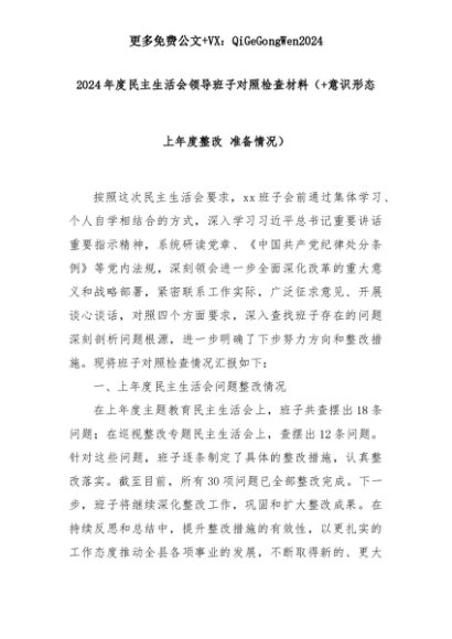 【七哥公文】2025年:2024年度民主生活会领导班子对照检查材料(+意识形态 上年度整改 准备情况)+更多免费公文+VX:QiGeGongWen2024+更多免费公文+VX:QiGeGongWen2024