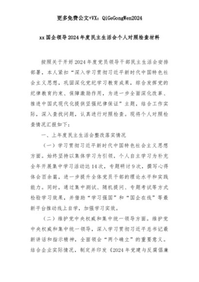 【七哥公文】2025年:xx国企领导2024年度民主生活会个人对照检查材料+更多免费公文+VX:QiGeGongWen2024+更多免费公文+VX:QiGeGongWen2024