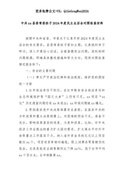 【七哥公文】2025年:中共xx县委常委班子2024年度民主生活会对照检查材料+更多免费公文+VX:QiGeGongWen2024+更多免费公文+VX:QiGeGongWen2024
