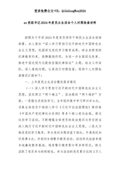 【七哥公文】2025年:xx党组书记2024年度民主生活会个人对照检查材料+更多免费公文+VX:QiGeGongWen2024+更多免费公文+VX:QiGeGongWen2024