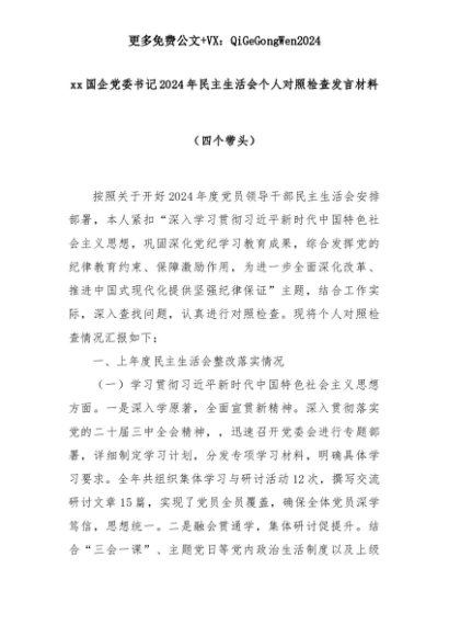 【七哥公文】2025年:xx国企党委书记2024年民主生活会个人对照检查发言材料(四个带头)+更多免费公文+VX:QiGeGongWen2024+更多免费公文+VX:QiGeGongWen2024