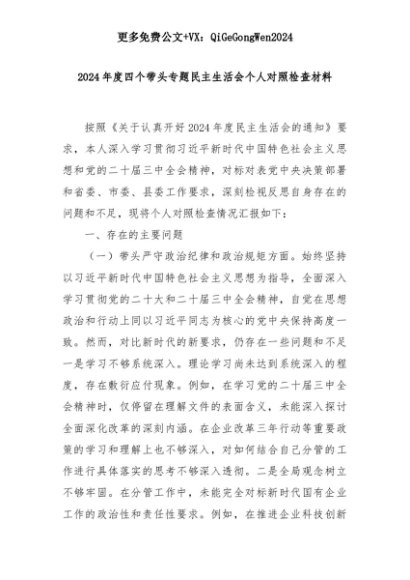 【七哥公文】2025年:2024年度四个带头专题民主生活会个人对照检查材料+更多免费公文+VX:QiGeGongWen2024+更多免费公文+VX:QiGeGongWen2024