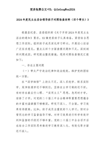 【七哥公文】2025年:2024年度民主生活会领导班子对照检查材料(四个带头)3+更多免费公文+VX:QiGeGongWen2024+更多免费公文+VX:QiGeGongWen2024