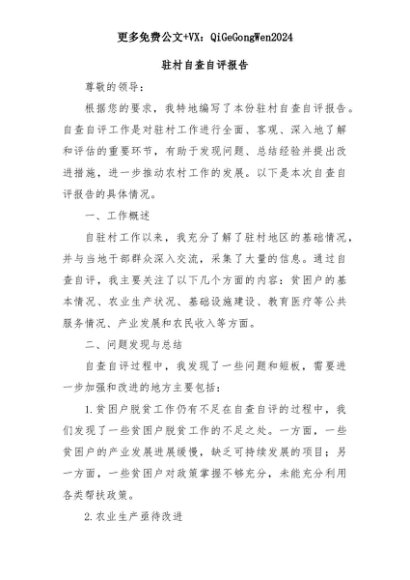【七哥公文】2025年:驻村自查自评报告+更多免费公文+VX:QiGeGongWen2024+更多免费公文+VX:QiGeGongWen2024