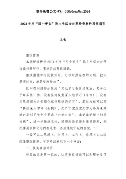 【七哥公文】2025年:2024年度“四个带头”民主生活会对照检查材料写作指引之七+更多免费公文+VX:QiGeGongWen2024+更多免费公文+VX:QiGeGongWen2024