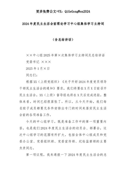 【七哥公文】2025年:2024年度民主生活会前理论学习中心组集体学习主持词(含总结讲话)+更多免费公文+VX:QiGeGongWen2024+更多免费公文+VX:QiGeGongWen2024